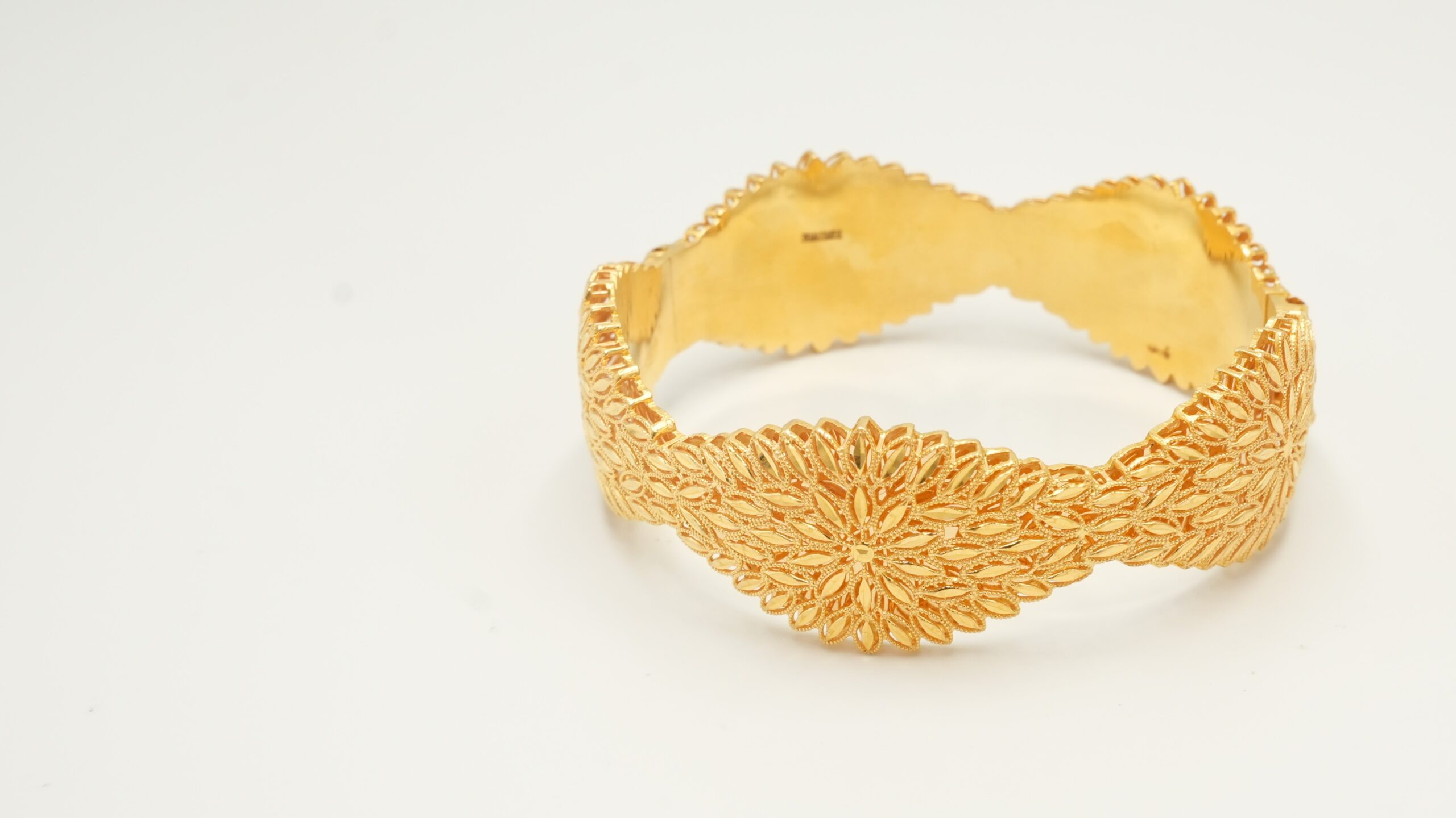 اسوارة ورق الشجر" خليجي من الذهب عيار 21 انغمس في الأناقة الفاخرة لـ سوار الكف ذو الطراز الخليجي المذهل، المعروف محليًا باسم "اسوارة ورق الشجر". صُنع هذا الطراز الرائع من ذهب عيار 21 عالي النقاء، ويتميز بنمط تخريمي دقيق ومعقد يجسد الجمال الطبيعي والرقي الخالد. مثالي للمناسبات الخاصة أو كقطعة مميزة تُلفت الأنظار، يمزج هذا السوار بين تصميم الخليجي التقليدي والجاذبية العصرية.