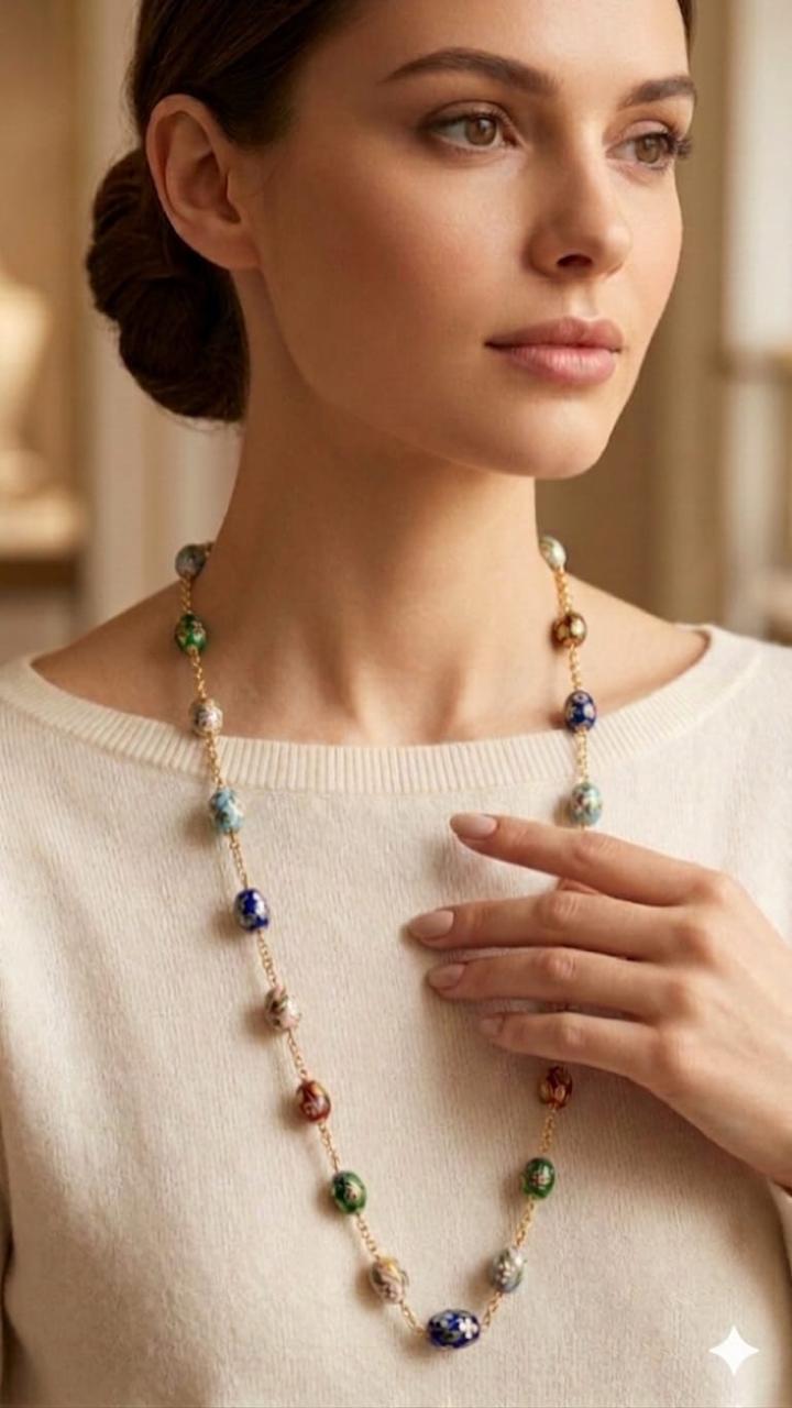 Design: A luxurious 21K gold chain adorned with multiple oval enamel charms in a rich palette of royal blue, crimson, forest green, and ivory.