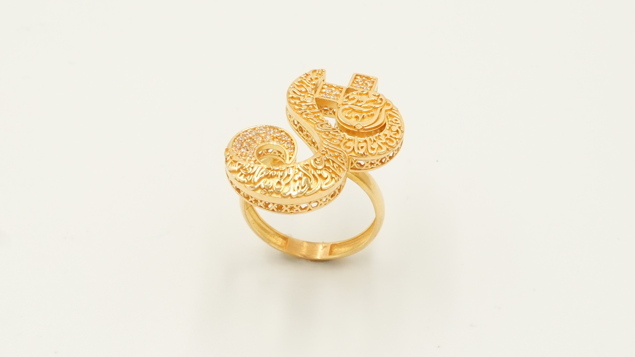 The ring face is divided into two sweeping sections, each featuring delicate open-work and deeply etched patterns reminiscent of traditional Middle Eastern metalwork.