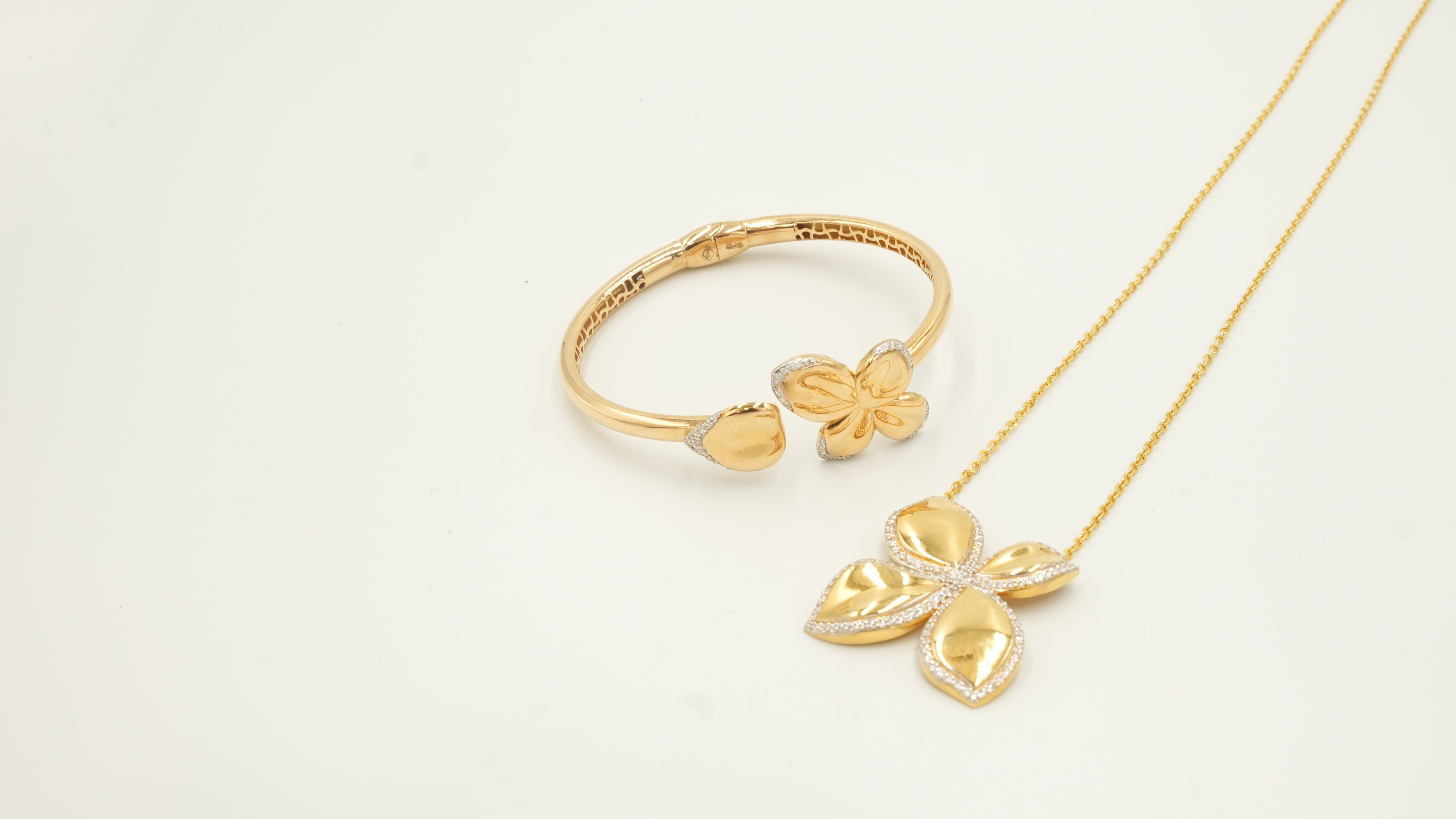 Embrace the timeless elegance of the Pasquil Flower Set. This curated duo includes a sophisticated open-cuff bracelet and a matching pendant, both featuring a distinctive four-petal floral motif inspired by the rare Pasquil bloom. Each piece is meticulously crafted from 18-karat yellow gold, combining smooth, voluminous surfaces with delicate shimmering borders for a truly radiant finish.